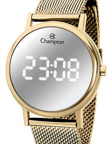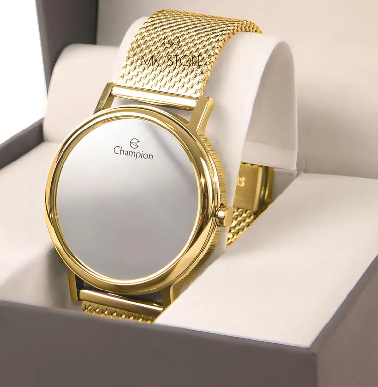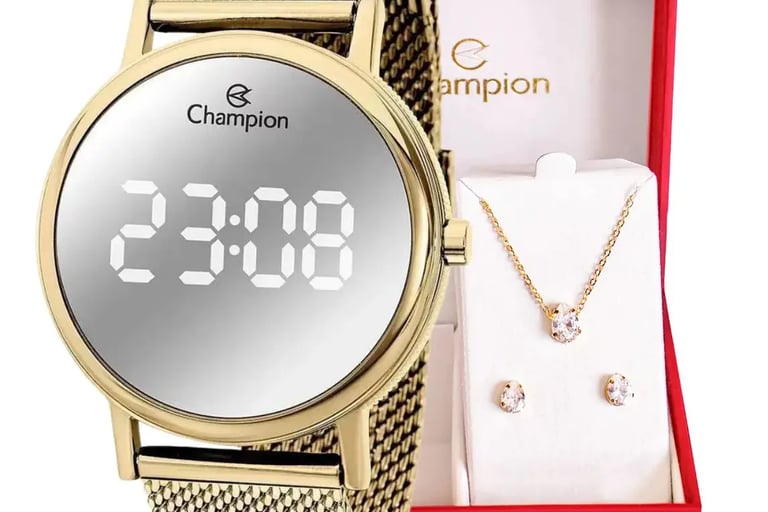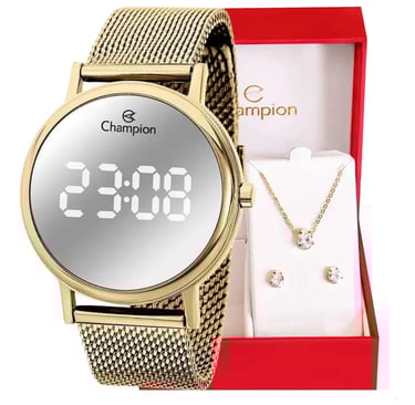 Kit Relógio Feminino Dourado Champion Digital Espelhado com Colar e Brincos